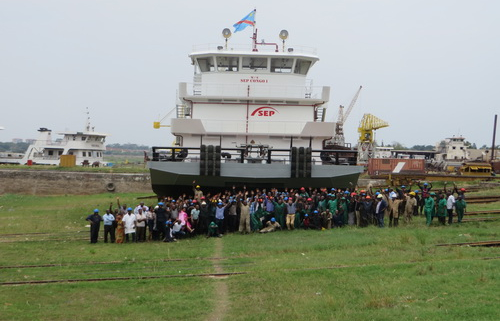 Mercredi 26 septembre 2018, Mise à l’eau et premier essai du pousseur SEP 2250 CV (3 x 750). Le pousseur le plus puissant jamais construit sur le fleuve Congo.